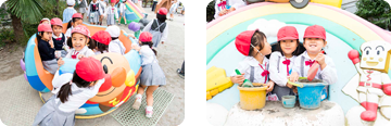 お天気の許す限り毎日元気いっぱいに遊具や砂場で先生と一緒に、思い切り外遊びを楽しみます。