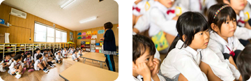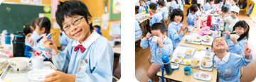 みんなの大好きな給食です。まずはみんなで力を合わせて給食を運びます。給食当番さんが盛り付けを手伝います。「天地(あめつち)の恵みと多くの人々の働きに感謝して」いただきます。