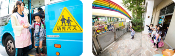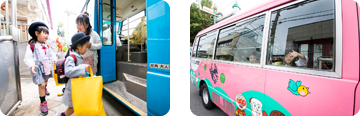 4台のアンパンマンバスがお出迎え。徒歩通園のお友だちも毎朝元気に先生とタッチをしてごあいさつ。