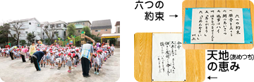毎朝全園児が並んで朝礼をします。六つの約束を始め、みんなで声を合わせて朝のごあいさつ。